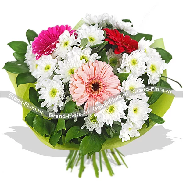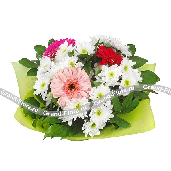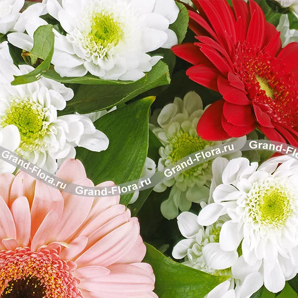 Стандартный (на фото): гербера разноцветная (розовая, красная и малиновая) - 3 шт, хризантема кустовая белая - 4 шт, салал, фетр зеленый.